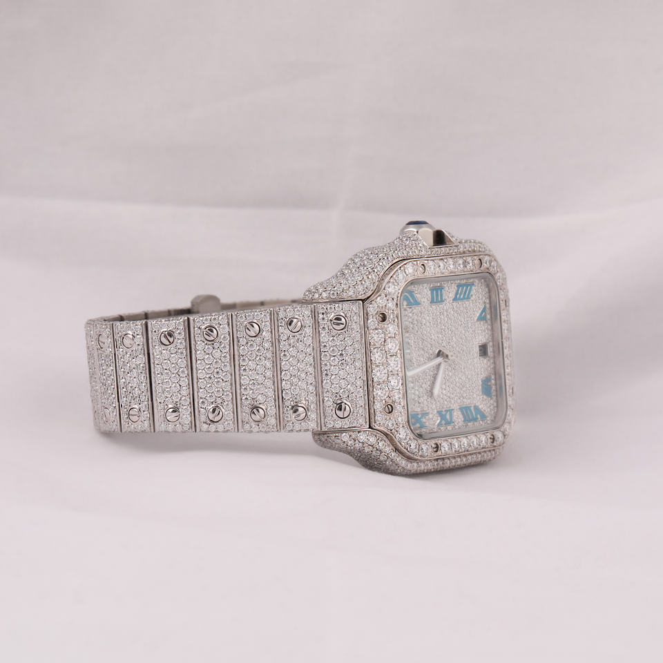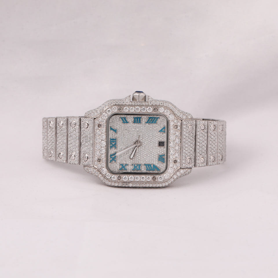 Superbe montre personnalisée entièrement glacé Moissanite Diamant en acier inoxydable Cadran de luxe classique avec date Bleu ciel Chiffres romains Caractéristiques