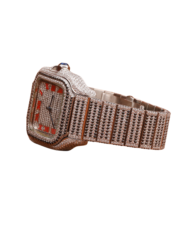 Montre en or blanc classique avec cadran rouge, sertie de diamants moissanite ronds glacés, personnalisée, magnifique, pour un cadeau unisexe