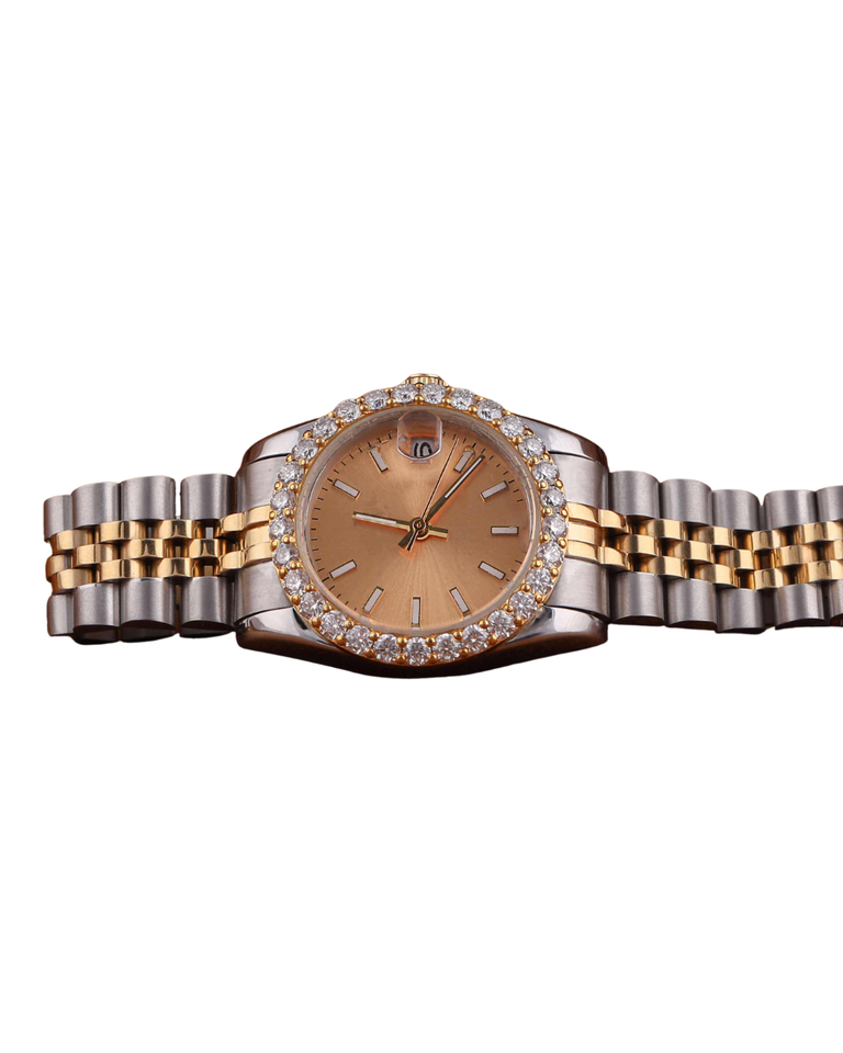 Montre personnalisée époustouflante avec cadran marron clair classique, sertie de diamants en moissanite taille ronde