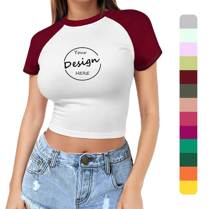 Design élégant personnalisé côtelé col rond femmes hauts courts t-shirt raglan femmes à manches courtes recadrée raglan t-shirt