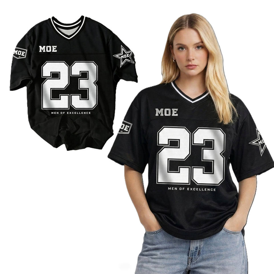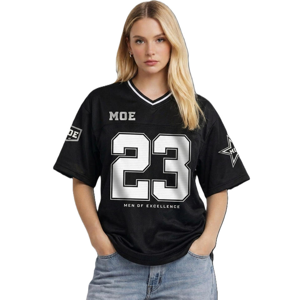 Maillot de football américain personnalisé sublimé, col en V en maille noire, coupe athlétique avec impression de grands numéros, OEM en gros