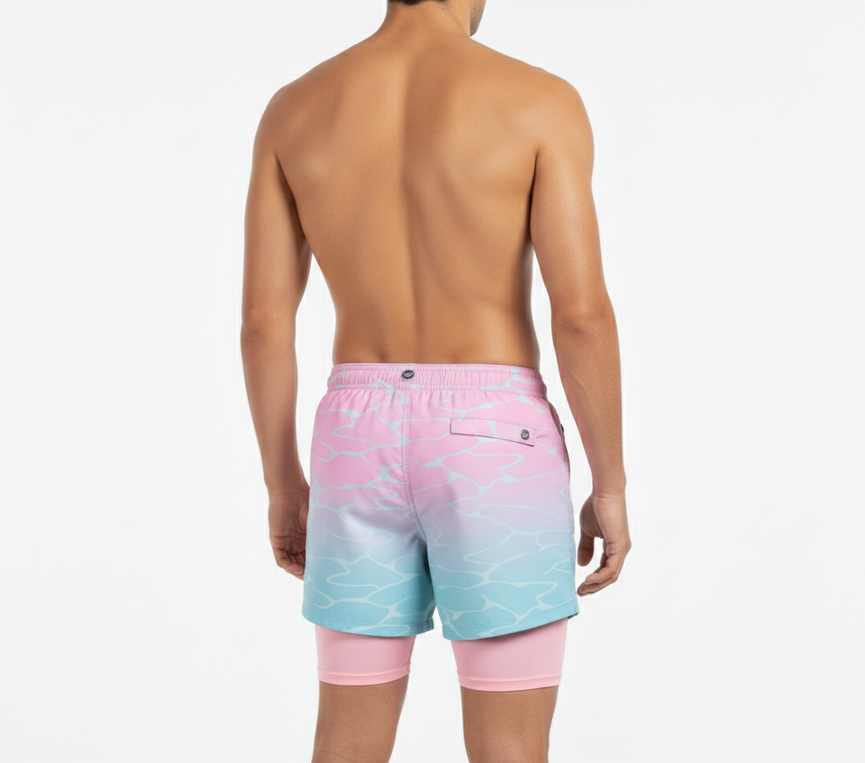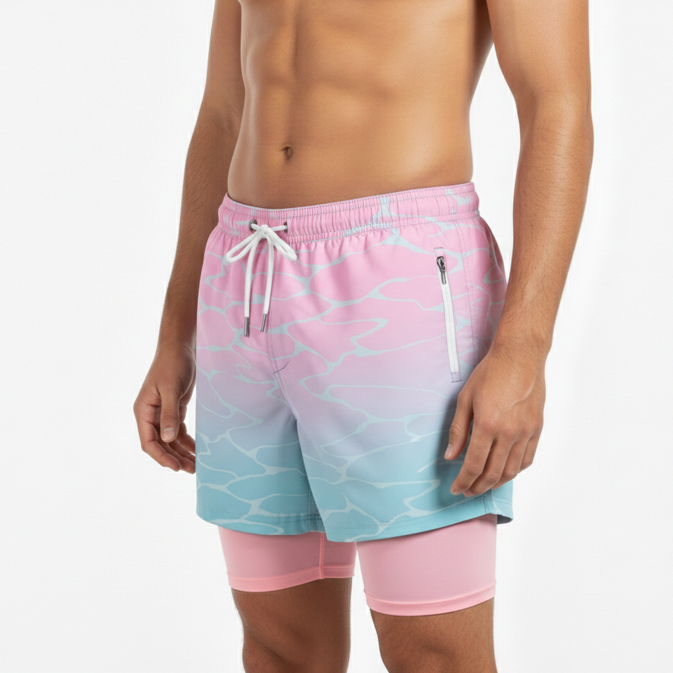 Shorts de plage pour hommes personnalisés par sublimation, shorts de bain 2-en-1 avec leggings de compression intégrés, tendance, séchage rapide, satin 100% polyester