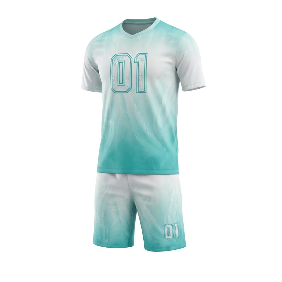 Tenues de football personnalisées pour hommes, motif plume, vert aqua et blanc, col en V, manches courtes, maillot respirant, vêtements de sport