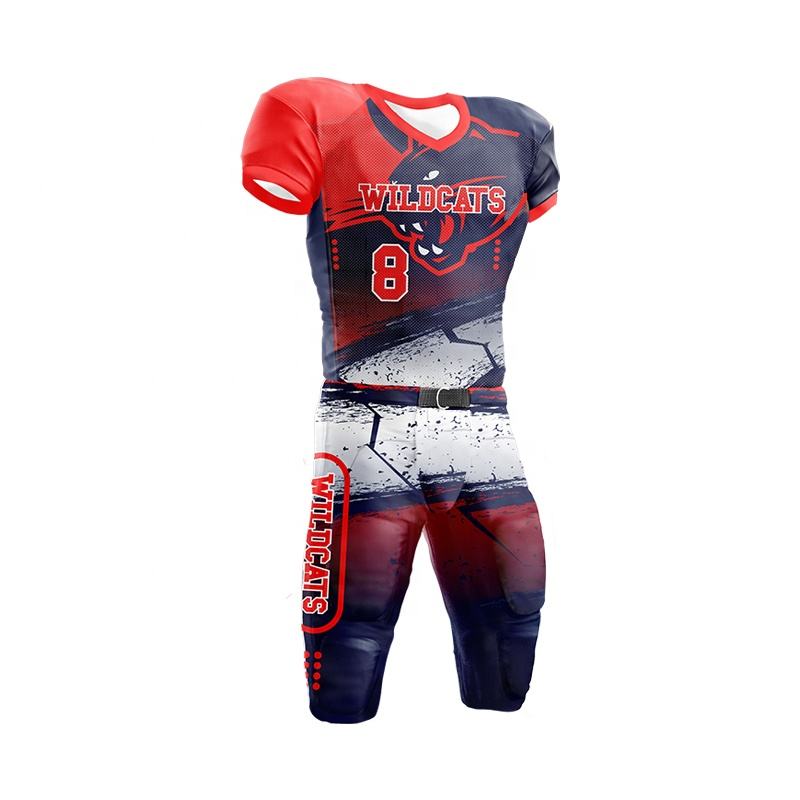 Ensembles d'uniformes de football américain personnalisés imprimés par sublimation pour adultes, respirants, manches courtes, 100% polyester, pantalon de jersey anti-UV