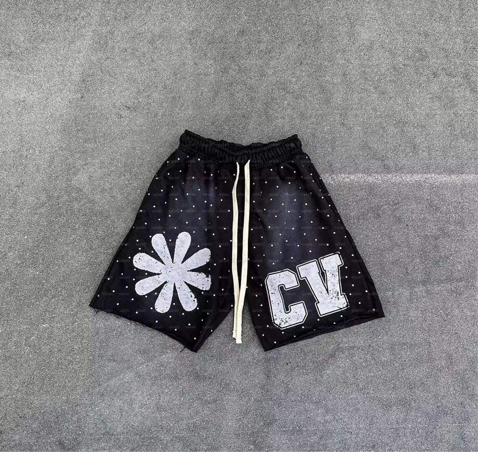 Short de survêtement d'été personnalisé coton Rhinestone puff imprimé soleil délavé à l'acide Streetwear Shorts pour hommes