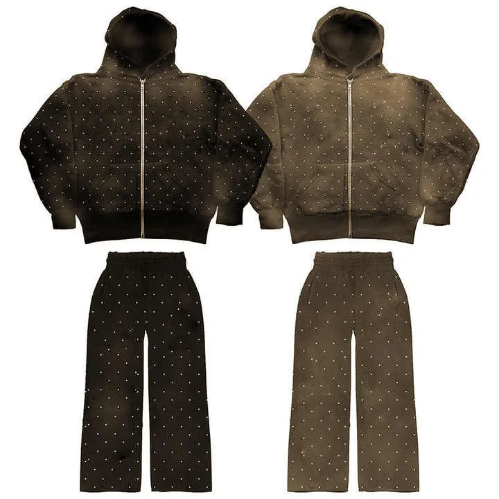 Ensemble survêtement homme personnalisé avec sweat à capuche et pantalon évasé, imprimé intégral effet délavé soleil, déchiré et délavé à l'acide, orné de strass