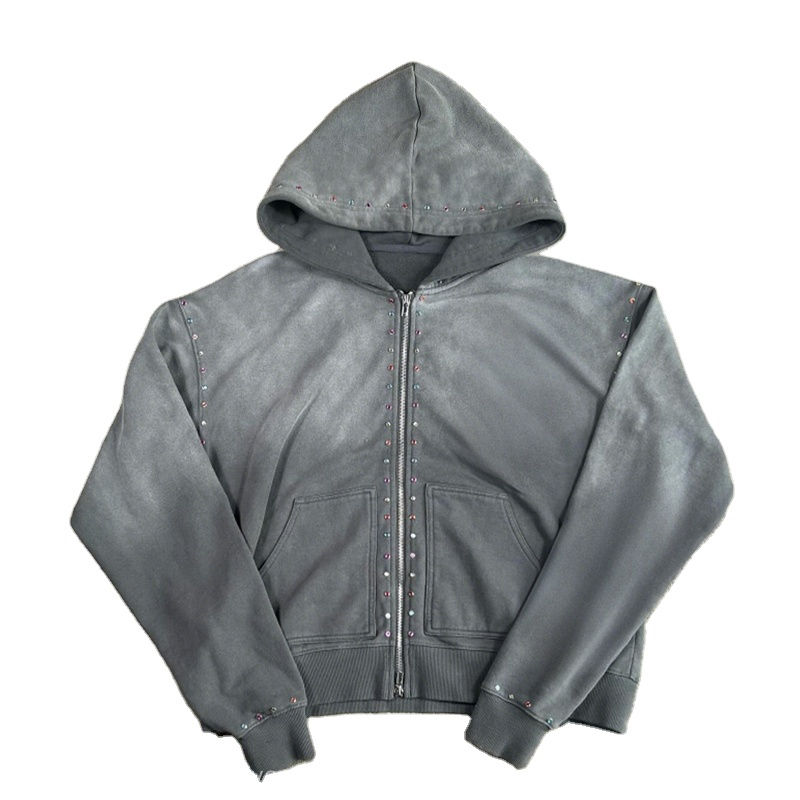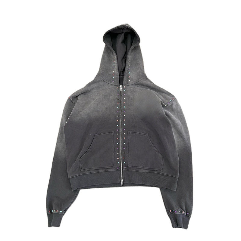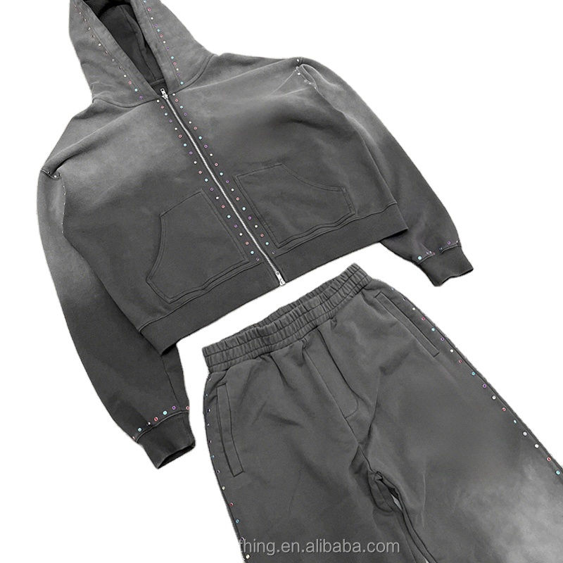 Survêtements personnalisés avec pile de pantalons Survêtement avec lavage à l'acide Sweat à capuche zippé en strass et pantalon de survêtement évasé Ensemble de survêtements pour hommes