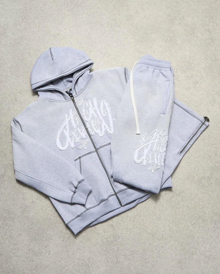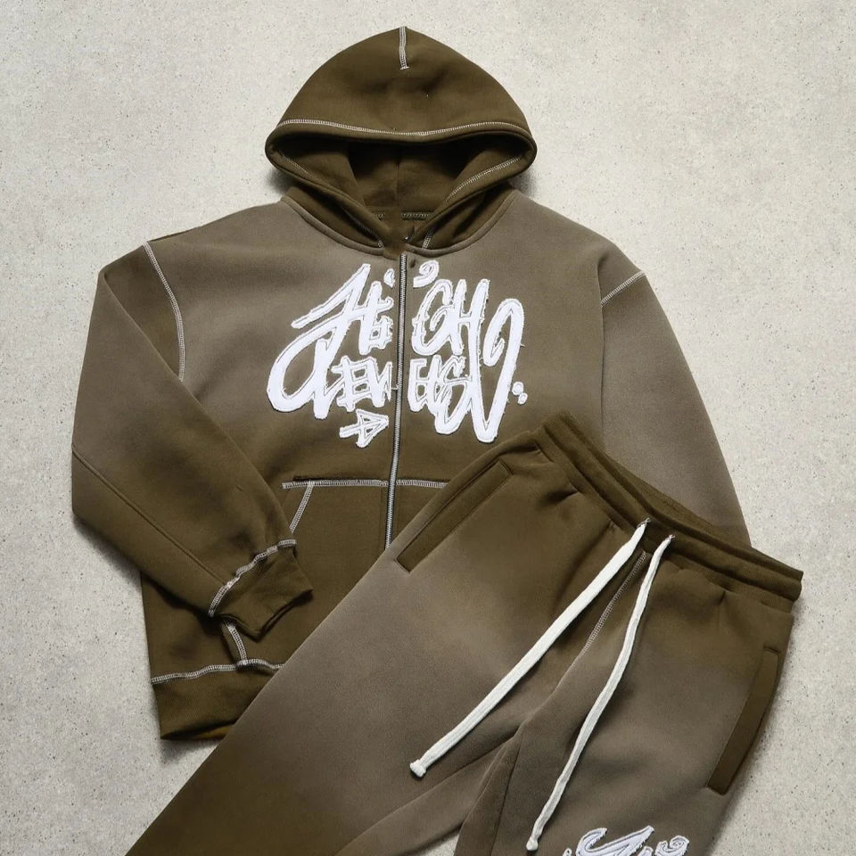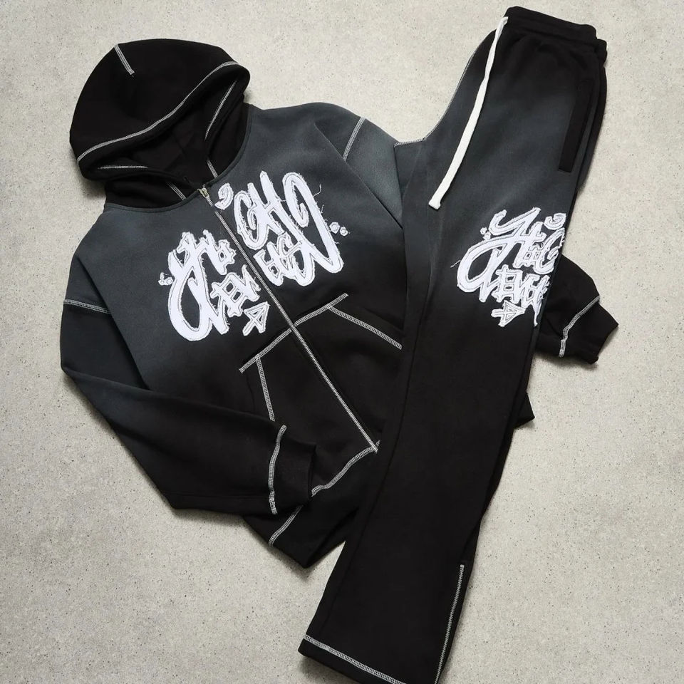 Survêtements personnalisés pour pantalons Sweat Stack Survêtement délavé à l'acide bouffée imprimée Sweat à capuche zippé et pantalon de survêtement évasé Ensemble de survêtement pour hommes