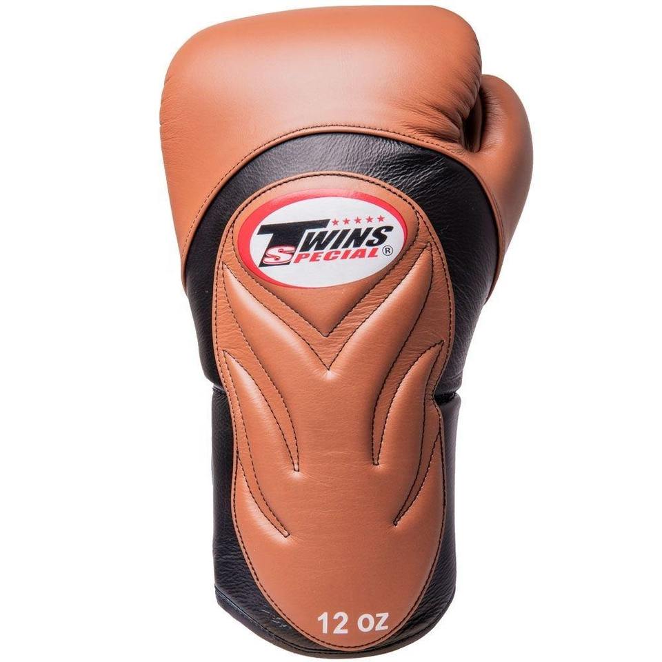 Gants de boxe Twins personnalisés à manches longues noirs et marron, en cuir premium, pour entraînement professionnel et sparring.