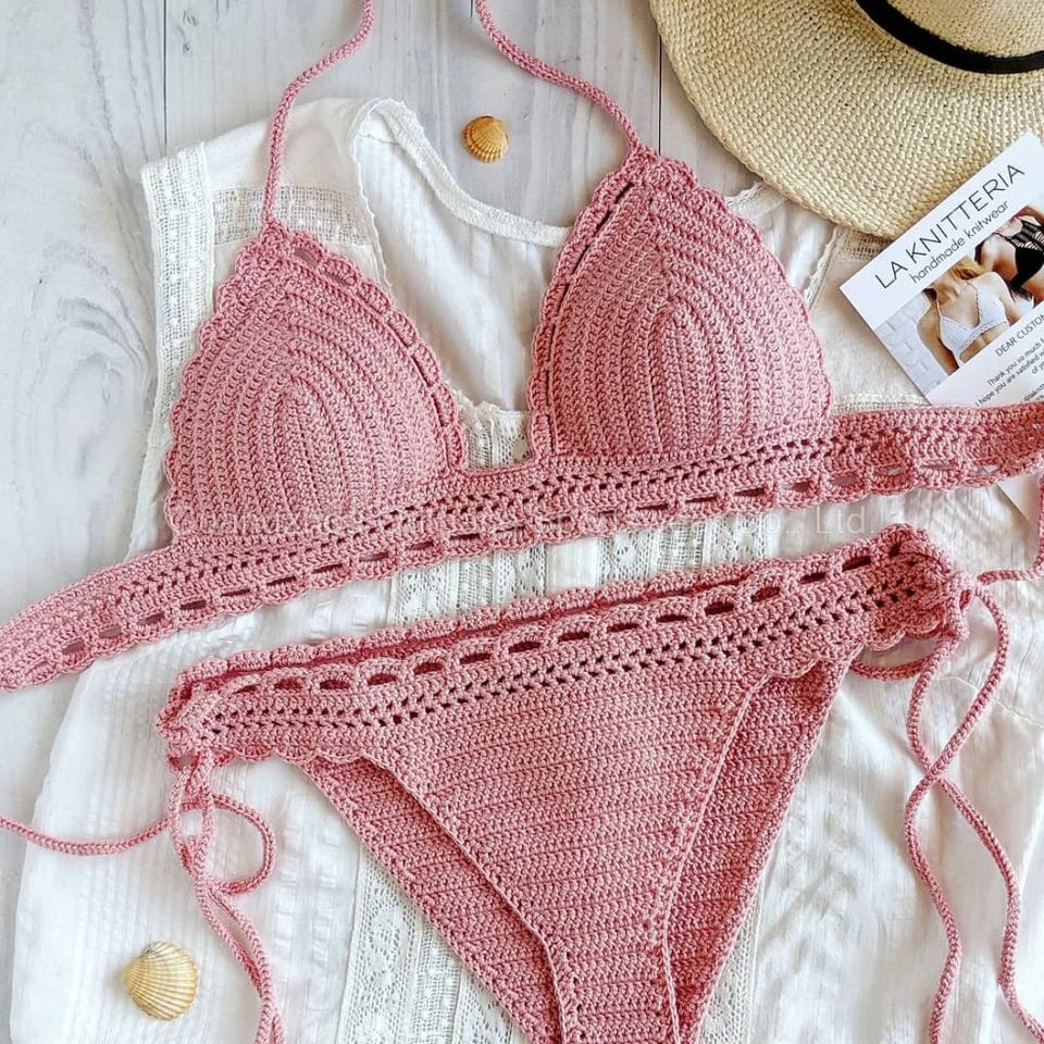 Maillot de bain deux pièces personnalisé en crochet tricoté à la main avec pompons, style coquillage, mini bikini à nouer, pour femme, idéal pour le fitness et la plage