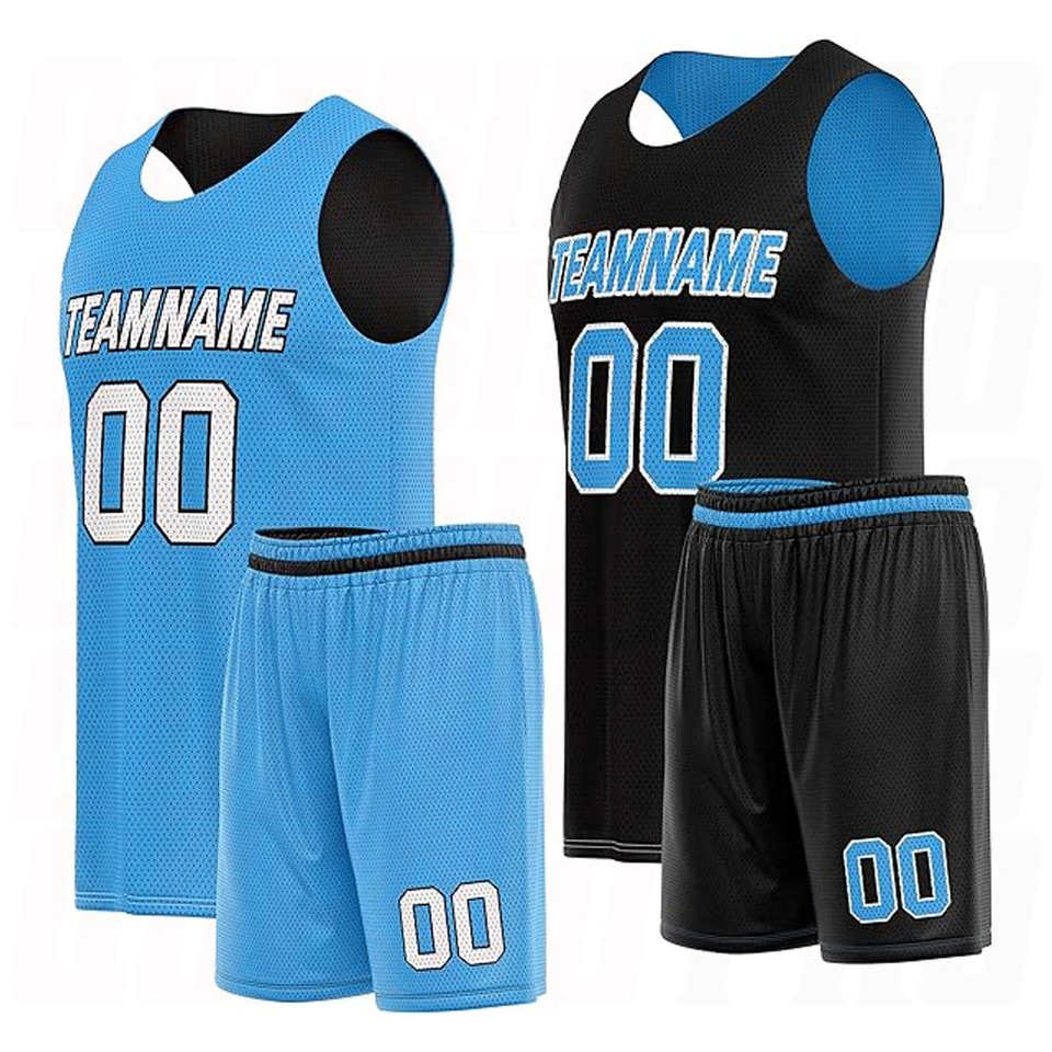 Ensembles d'uniformes de basketball personnalisés pour hommes avec nom d'équipe, maillot et short de sport respirants en polyester, bleu ciel et noir, sublimation, été, devant
