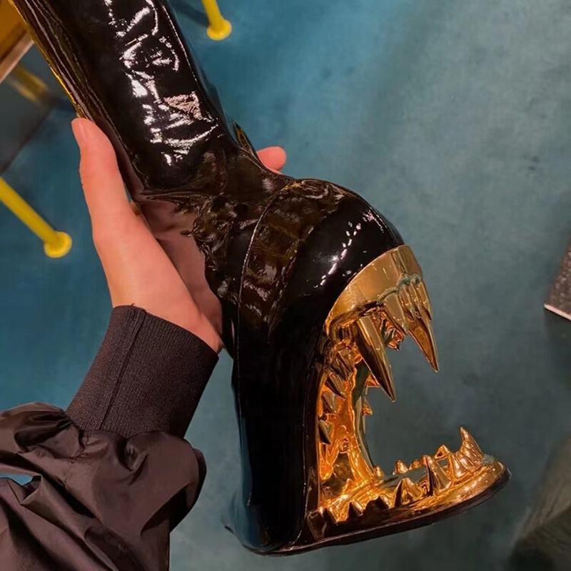 Bottes cuissardes moulantes pour femme à talons compensés personnalisés, bout pointu, en cuir verni