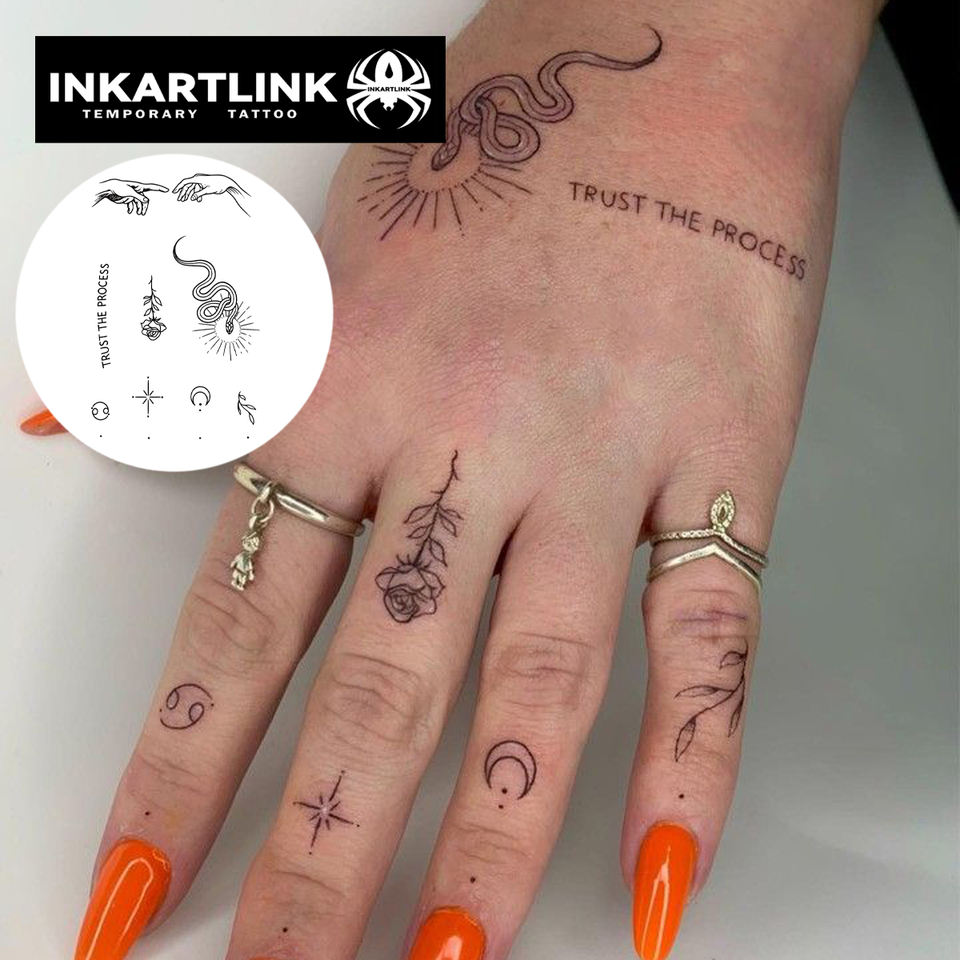 Autocollant de tatouage temporaire personnalisé pour doigt, motif serpent, rose, lune, minimaliste, à base de plantes, semi-permanent 15 jours, art corporel, vente en gros