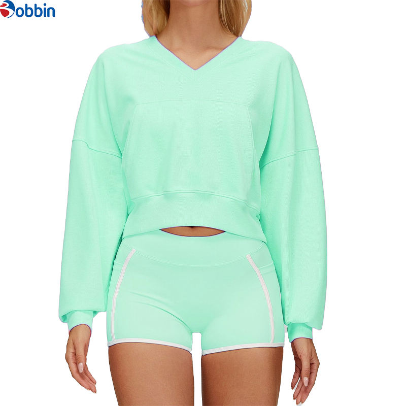 Ensembles de sport d'hiver personnalisés pour femmes grandes tailles, comprenant des sweats à capuche courts à col en V et des shorts à manches longues, 2 pièces