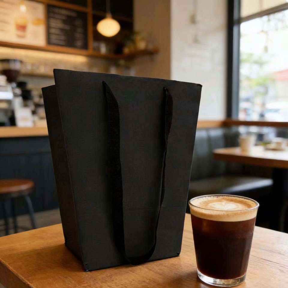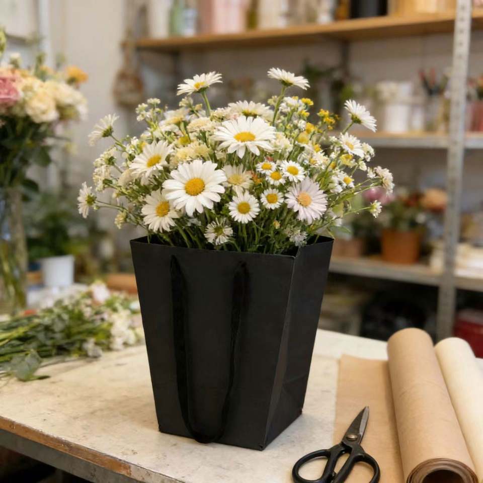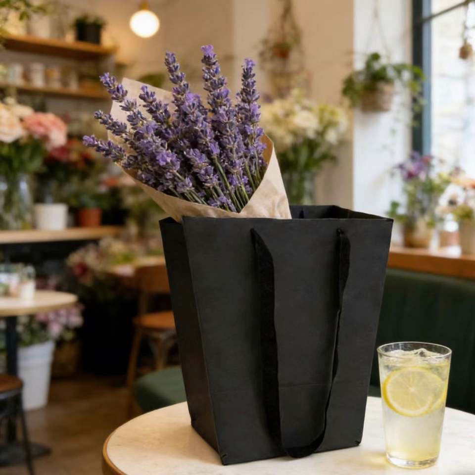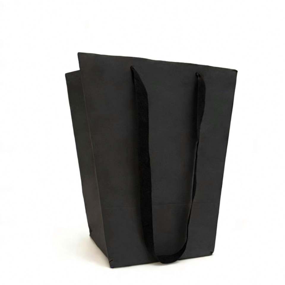 Sacs en papier kraft noir trapézoïdaux personnalisés avec poignées torsadées recyclables pour l'emballage de bouquets de fleurs faits main pour les fêtes