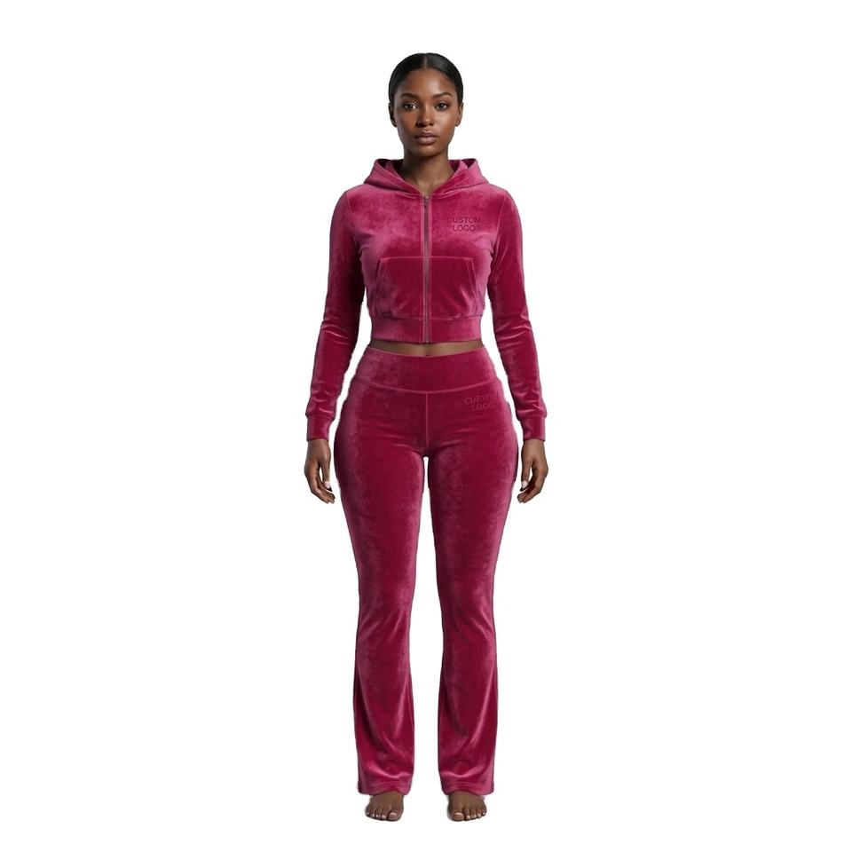 Ensemble de survêtement en velours deux pièces personnalisé pour femme, avec sweat à capuche zippé, veste courte et pantalon de jogging en velours