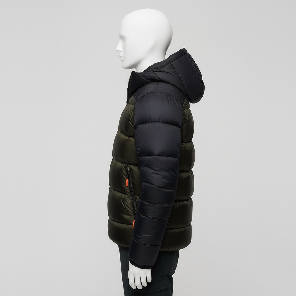 Blouson matelassé personnalisé bicolore, corps vert, manches noires, capuche, manteau d'hiver rembourré, fermeture éclair isolée, broderie sur le devant