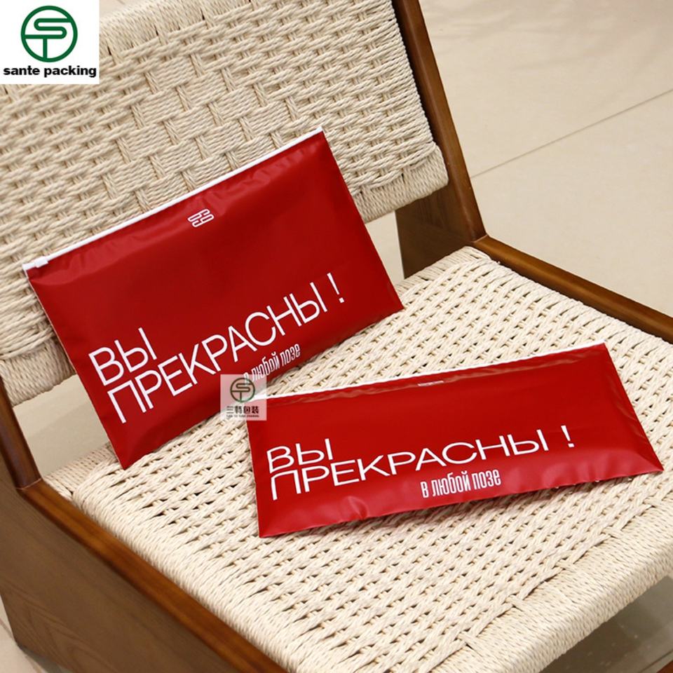 Sacs d'expédition à fermeture éclair personnalisés avec logo typographique, en CPE mat rouge dépoli, pour l'emballage de vêtements