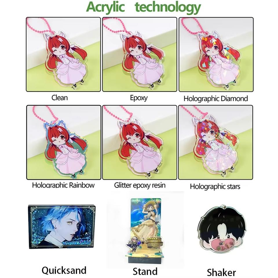 Breloques en époxy imprimées UV personnalisées, breloques en acrylique transparent miroir holographique arc-en-ciel, breloques de dessin animé en acrylique, porte-clés à secouer, breloques de téléphone