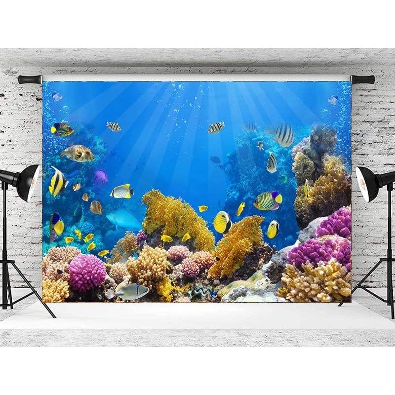 Toile de fond photo personnalisée pour monde sous-marin récifs coralliens et poissons tropicaux en vinyle pour fêtes sur le thème de l'océan en stock