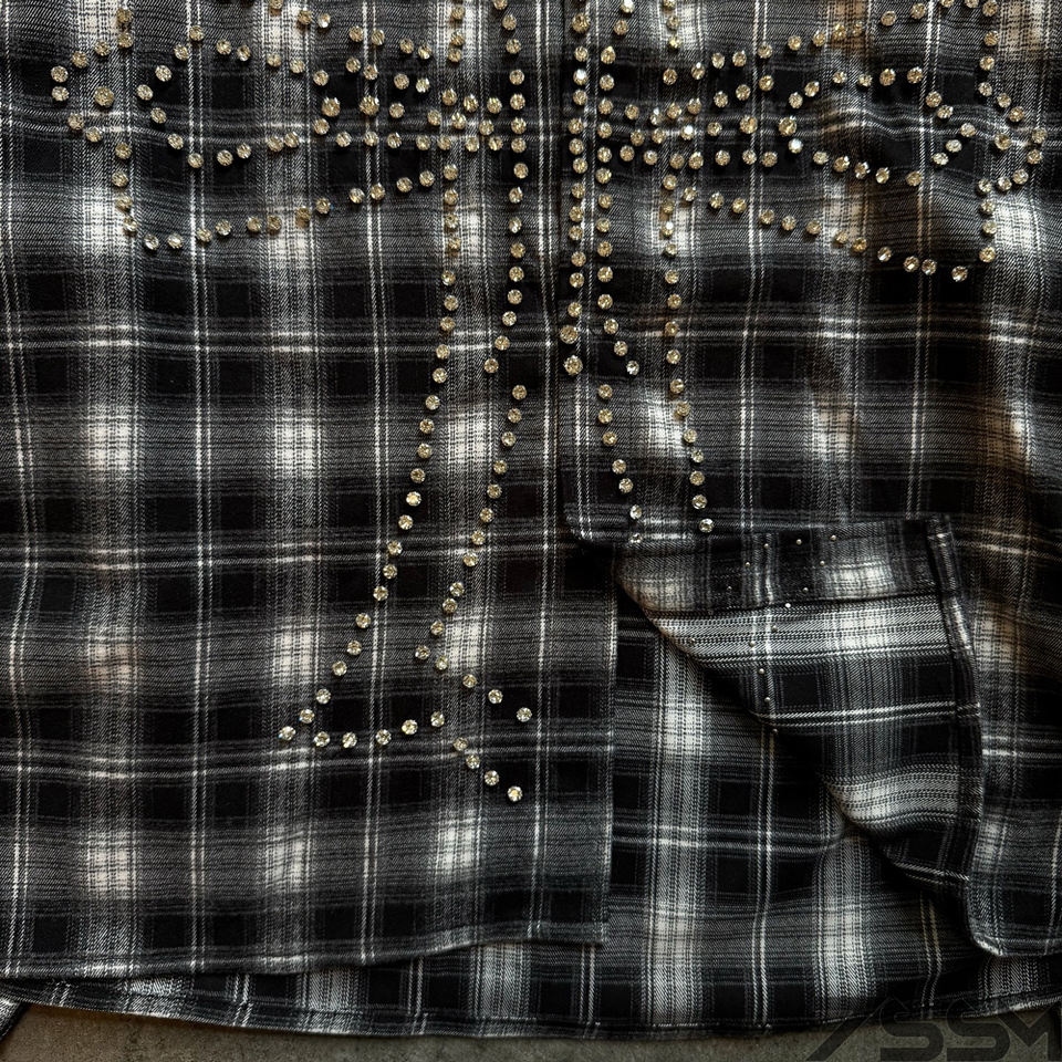 Personnalisé Unisexe Bouton Baggy Plaid Chemise à Manches Longues pour Hommes Coton Lavage À L'acide Détresse Flanelle Strass Revers Streetwear Chemises