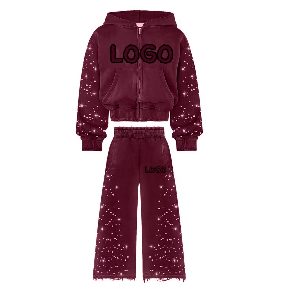 Survêtement personnalisé unisexe à imprimé bouffant et strass, survêtement surdimensionné à fermeture éclair délavé à l'acide, survêtement personnalisé pour hommes OEM