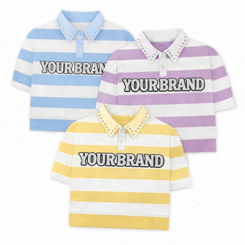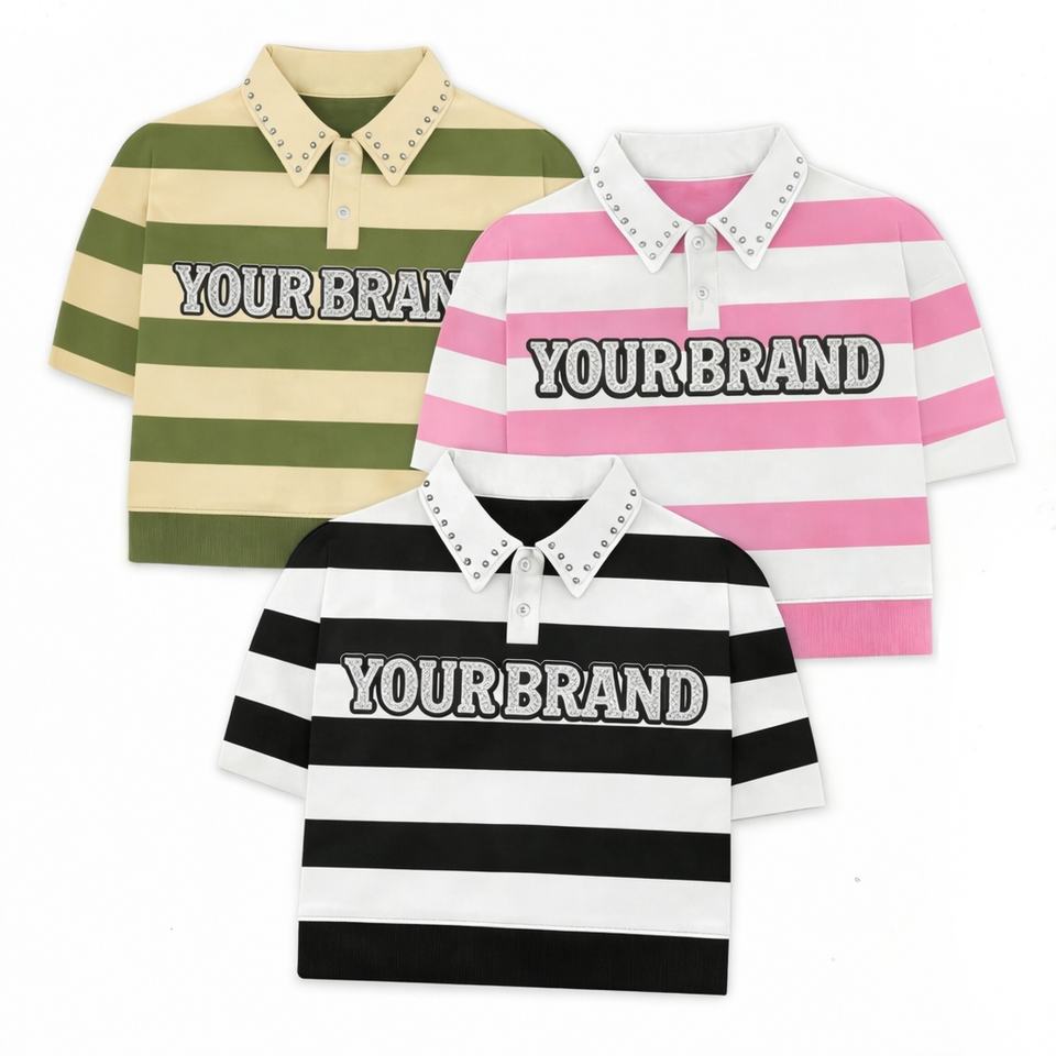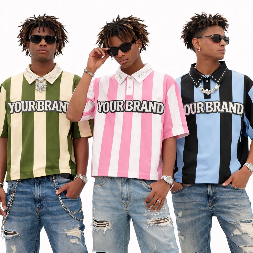 Polo de rugby à rayures verticales personnalisé pour hommes, 100 % coton, broderie en strass, coupe ample, style streetwear