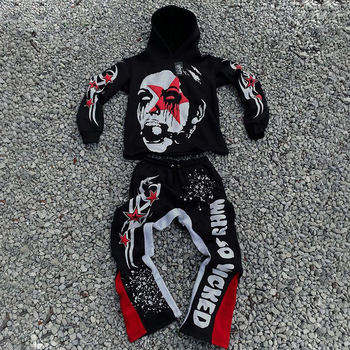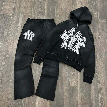 Streetwear vintage personnalisé 100% coton ensemble de jogging imprimé par transfert de chaleur lavage à l'acide survêtement à capuche pantalon de survêtement évasé droit