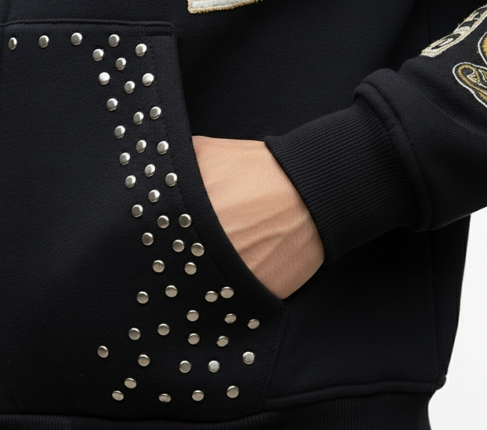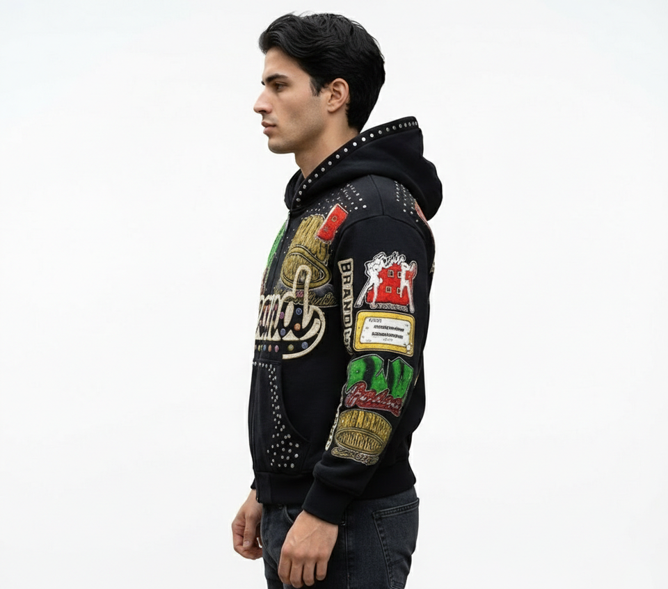 Sweat à capuche d'hiver unisexe surdimensionné en coton biologique 100% épais, avec broderie vintage délavée, patchwork et fermeture éclair ornée de strass