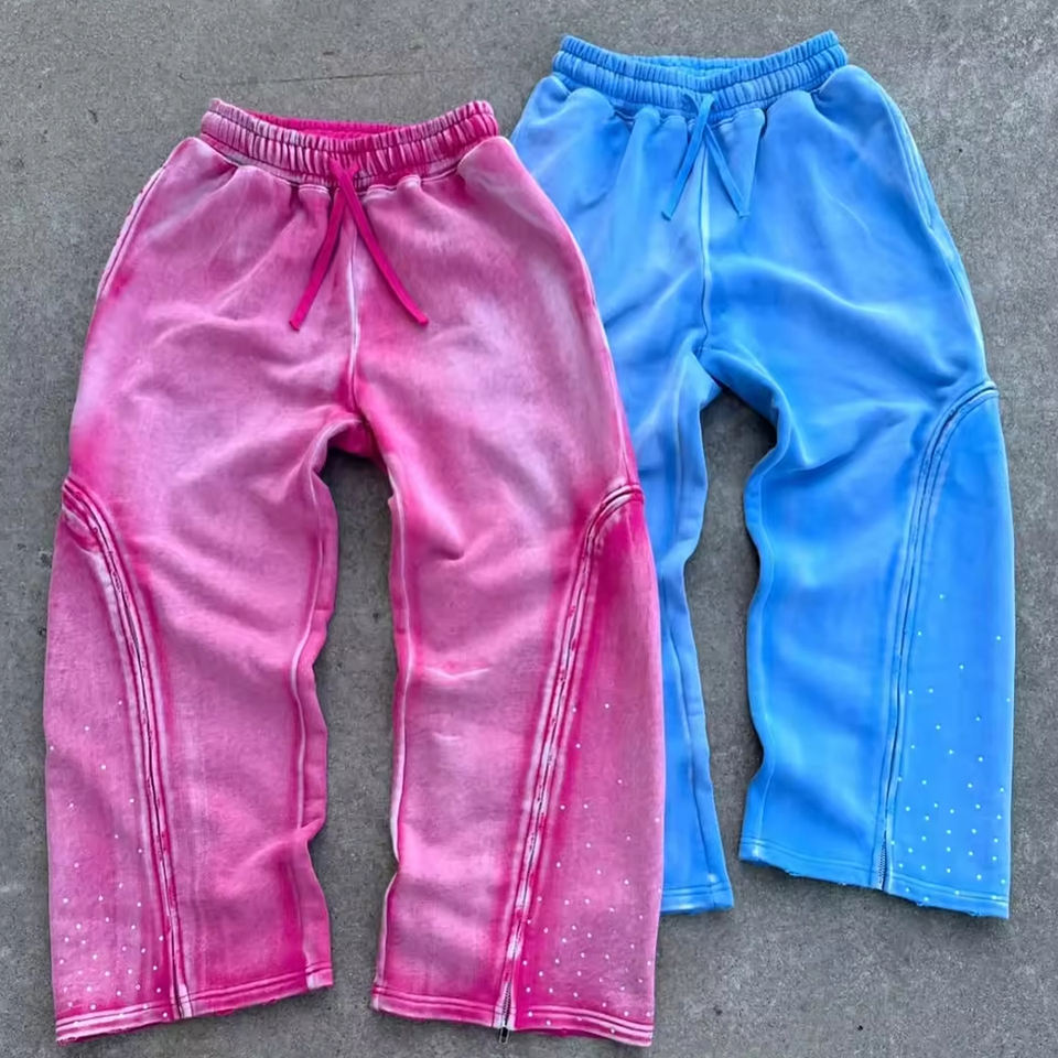 Custom Vintage Washed Pant Detachable Zip Rhinestone Drawstring Baggy Sweatpants