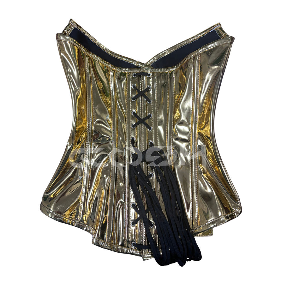 Corset amincissant sur mesure à haute compression et maintien ferme en vinyle PVC doré brillant, style overbust, pour tenue de club - Fournisseur