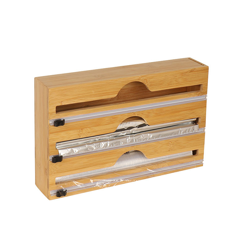 Distributeur mural personnalisé 3-en-1 en bambou et plastique pour film alimentaire et papier d'aluminium avec coupe-glissière intégré