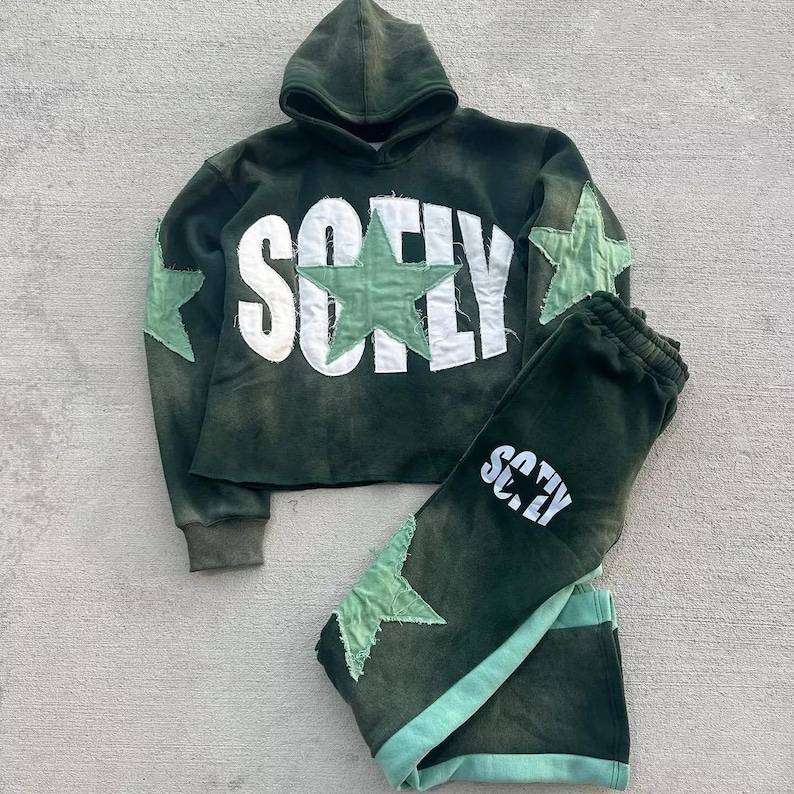 Ensemble de survêtement 2 pièces en coton pur lourd, délavé et vieilli, coupe évasée, pour homme, vente en gros, pas cher, 100% coton