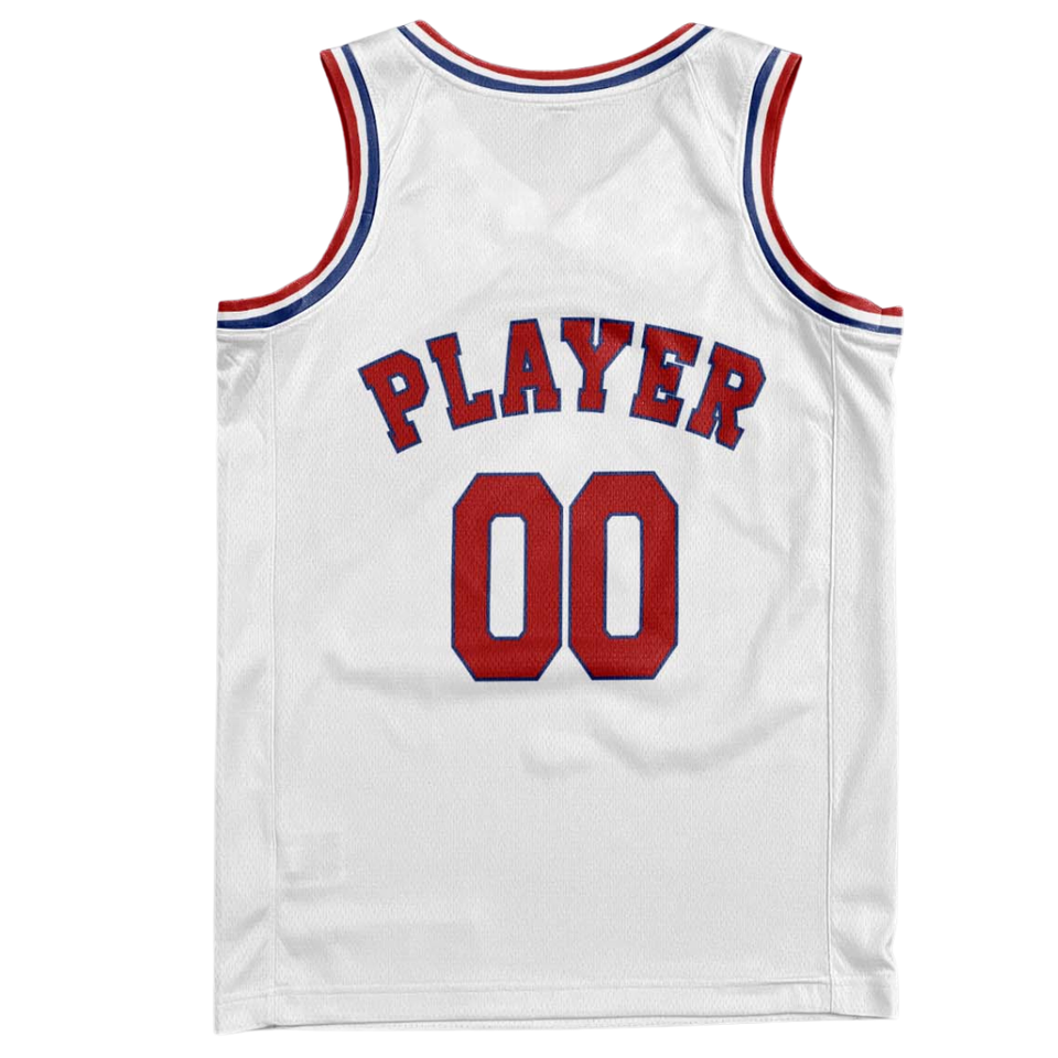 Ensemble uniforme de basket-ball personnalisé blanc style rétro, maillot à col rouge et bleu, short assorti, nom et numéro de l'équipe rétro