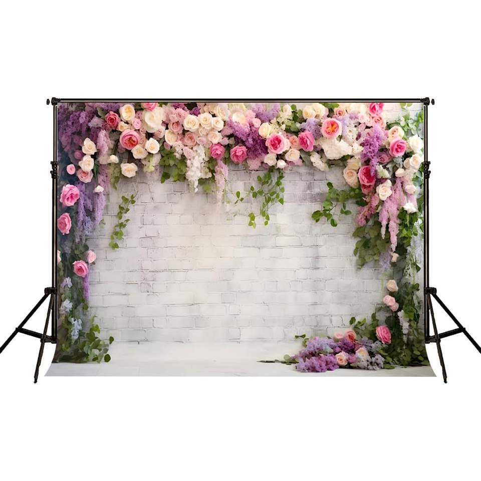 Toile de fond murale brique blanche personnalisée pour événements Stock photographie anniversaire mariage nouveau-né fleurs colorées décor vinyle