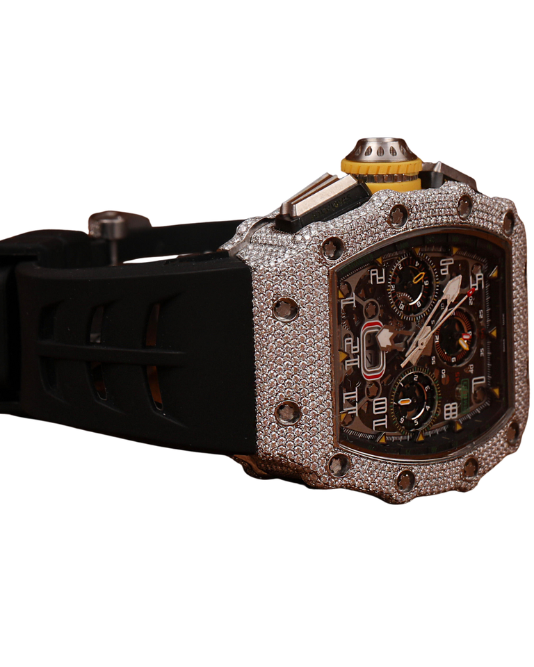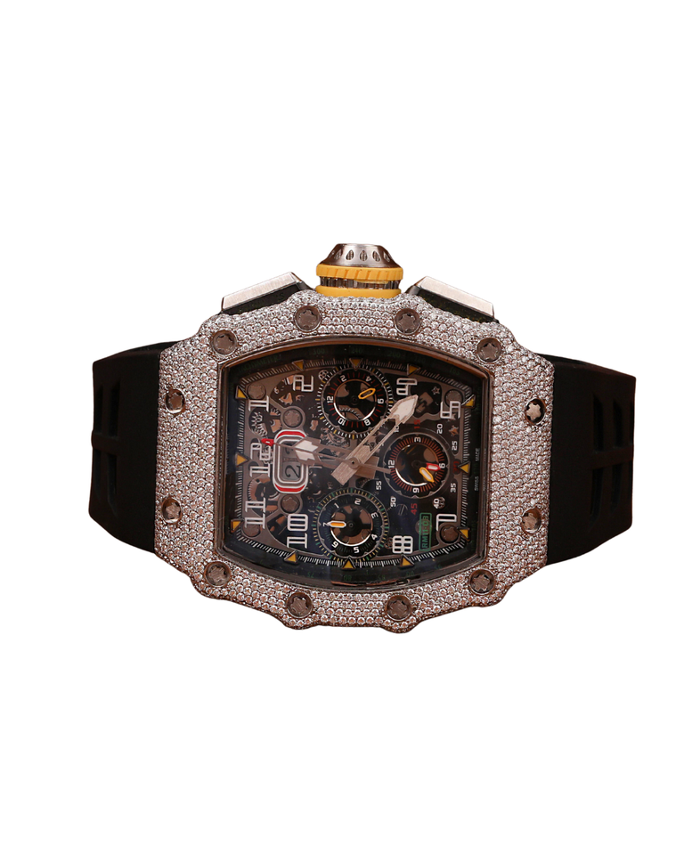 Custom White Gold Iced Out Round Cut Moissanite Diamond Classic Date Black Belt Dial Features Diamond Watch For Men's