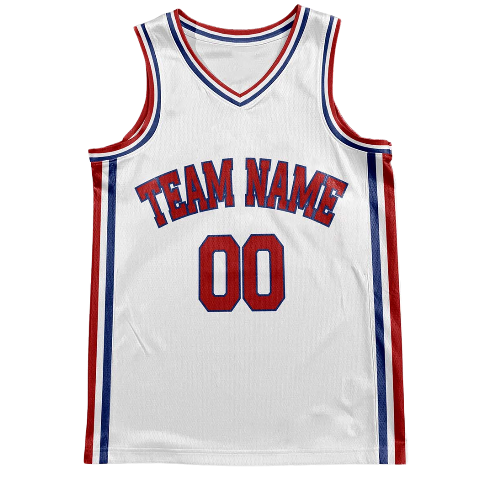 Ensemble d'uniformes de basket-ball personnalisés blancs et simples, style rétro, avec bordure rouge et bleue, maillot et short, design rétro avec nom et numéro d'équipe