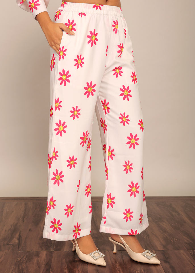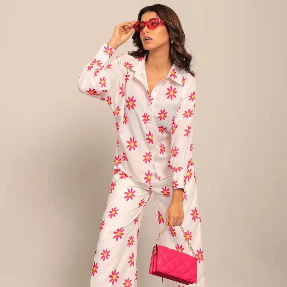 Nom du produit:Chemise et pantalon décontractés à imprimé floral blanc et rouge Western Co-Ord