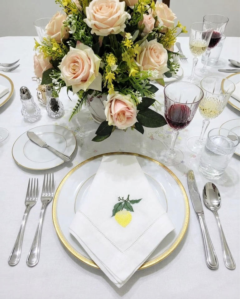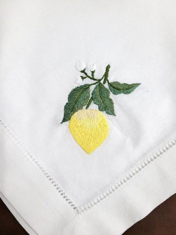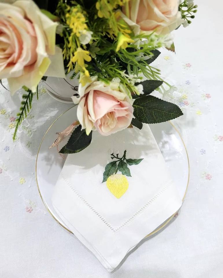 Serviette en coton brodée personnalisée, style classique, motif citron, délavage à la pierre, ourlet festonné, 60x60cm, faite à la main, réutilisable, lavable en machine, vente en gros