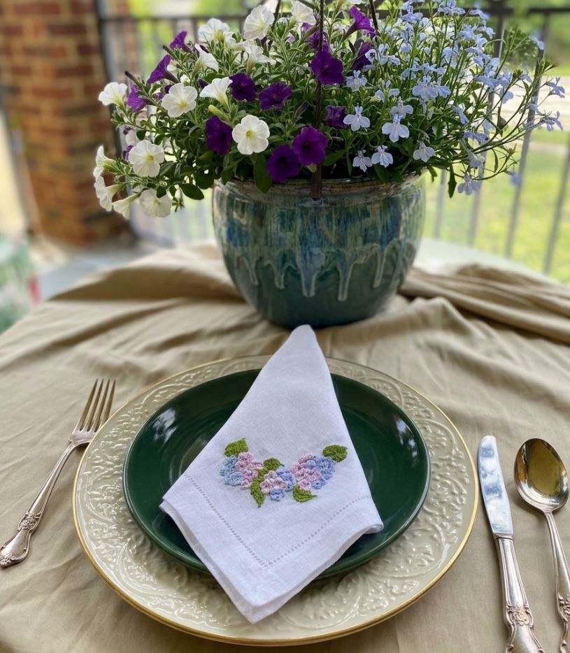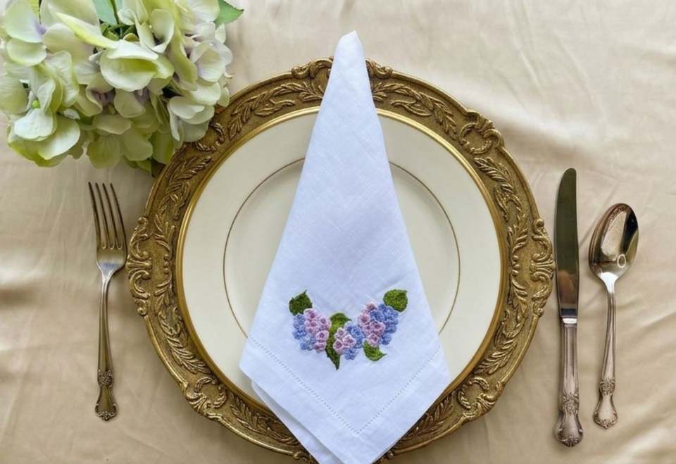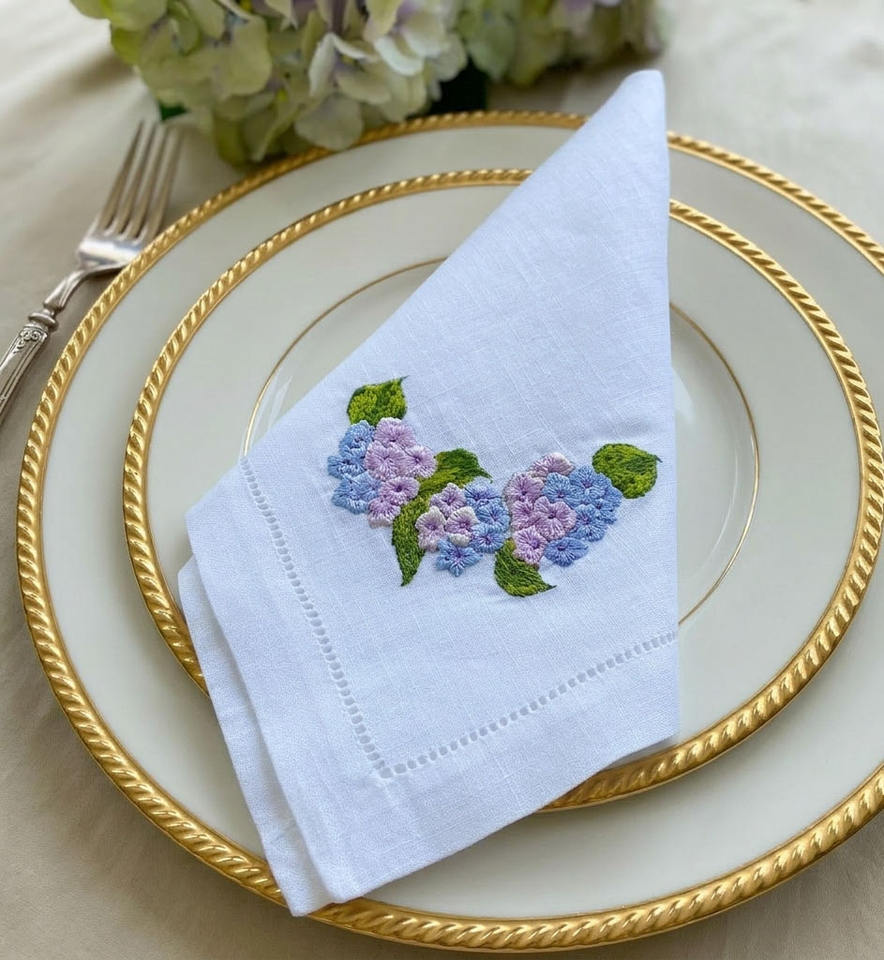 Serviettes en tissu personnalisées en gros, broderie fleur d'hortensia, serviettes de table en lin avec ourlet festonné, durables pour la maison, les mariages et les événements