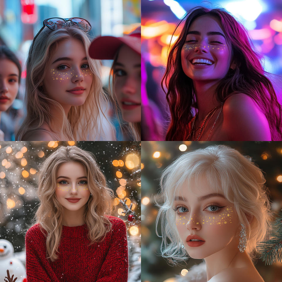 Tatouages faciaux de fête personnalisés en gros, non toxiques, de haute qualité, sexy, mignons, paillettes dorées en forme de flocon de neige, Halloween, Noël, vacances
