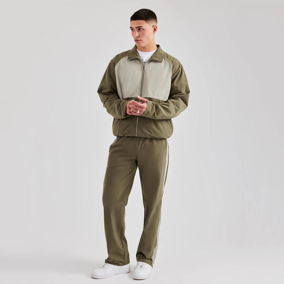 Vente en gros sur mesure veste de survêtement à col entonnoir et jogging en nylon panneau kaki tissu doux survêtement pour homme 2 pièces ensemble pour homme sweat à capuche zippé