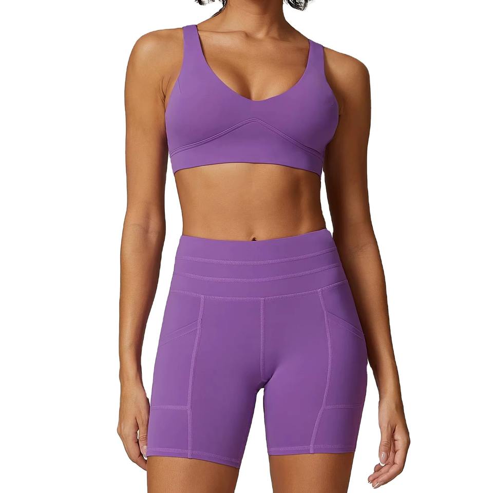 Ensemble de yoga personnalisé en gros, grande taille, respirant, sans couture, soutien-gorge de sport et short taille moyenne, couleur unie, doux, offrant un bon maintien et un ajustement confortable