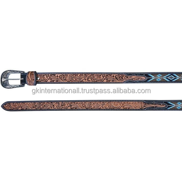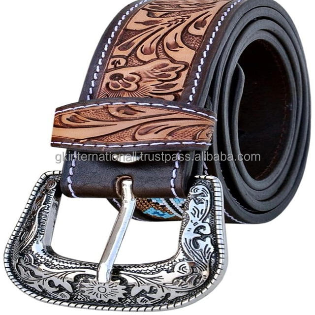 Ceinture western large en cuir véritable, fabriquée à la main, en cuir de vachette pleine fleur, avec incrustations de perles colorées et motifs floraux gravés, ceinture de cowboy.
