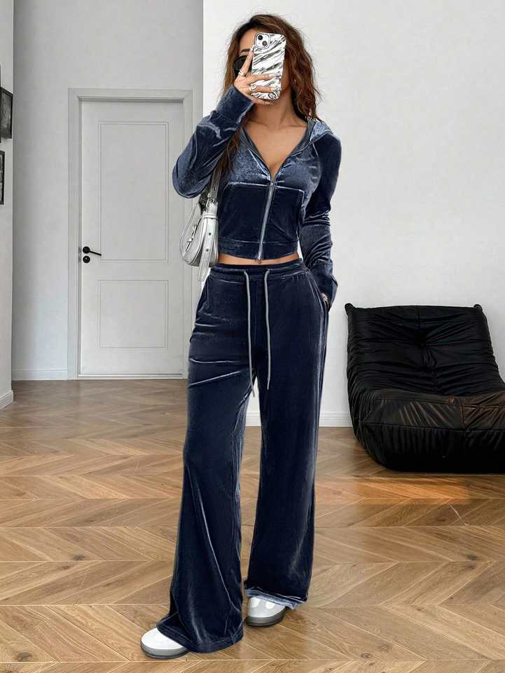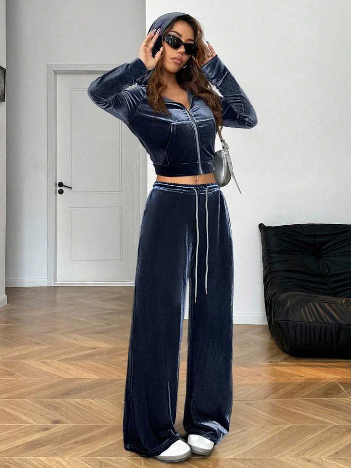 Ensemble de survêtement en velours bleu personnalisé avec strass, sweat à capuche et pantalon, pour l'hiver, 2 pièces, unisexe, streetwear, léger