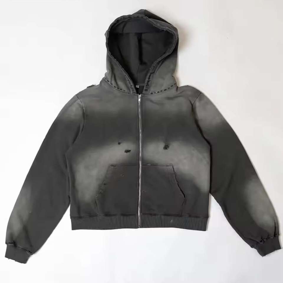 Ensemble survêtement personnalisé en coton lourd délavé à l'acide, effet vieilli et décoloré par le soleil, avec sweat à capuche zippé et pantalon de survêtement, unisexe, vintage