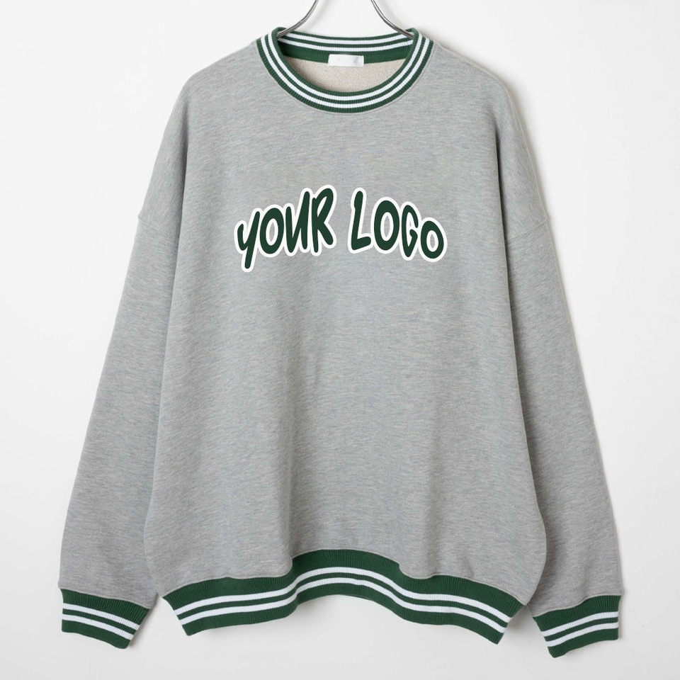 Sweat-shirt gris d'hiver personnalisé avec col et ourlet rayés verts, pull unisexe en coton avec logo imprimé numériquement, streetwear décontracté