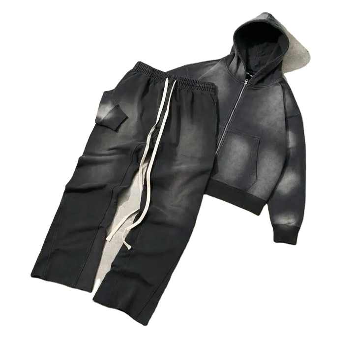 Survêtement personnalisé imprimé d'hiver avec patchwork vieilli | Sweat à capuche délavé à l'acide avec cordon de serrage et pantalon de jogging évasé | Survêtements