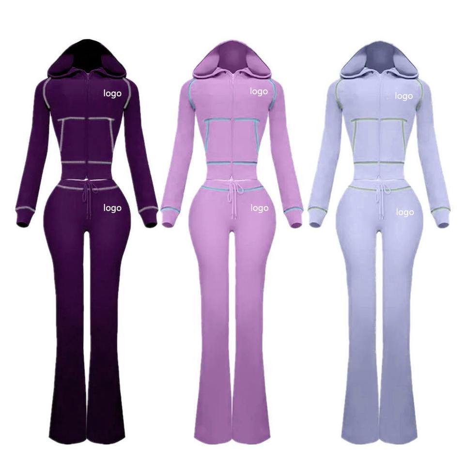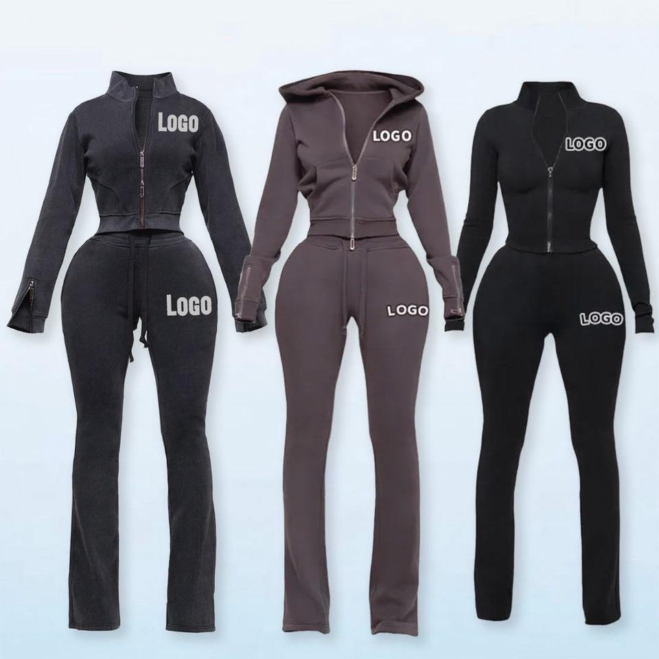 Ensemble personnalisé en tricot gaufré pour femme, ensemble de survêtement à manches longues, veste à capuche zippée et pantalon évasé à jambes larges, ensemble deux pièces