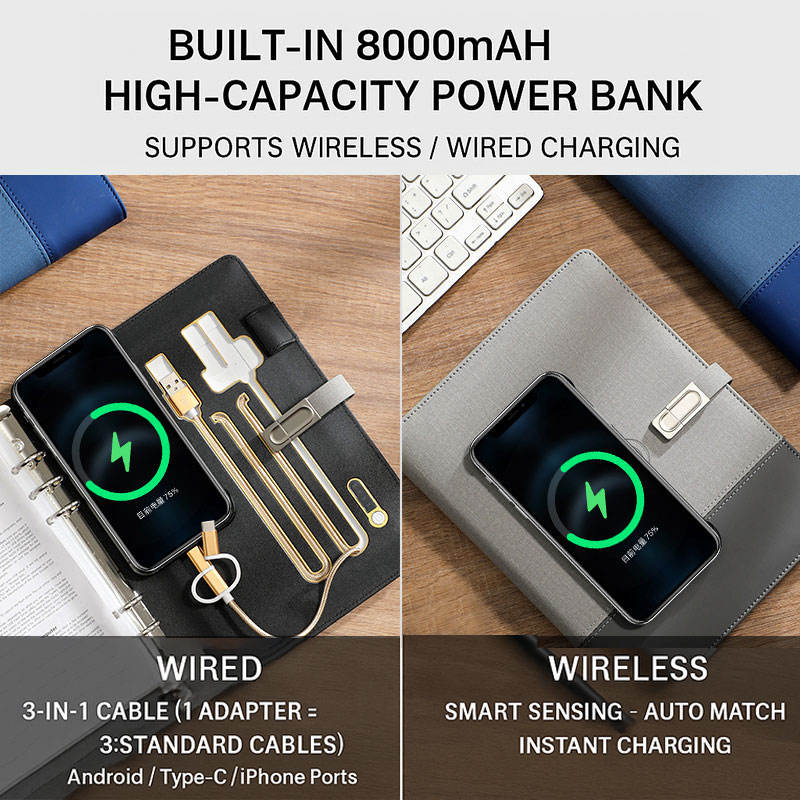 Organisateur de chargeur sans fil personnalisé, carnet intelligent en cuir, batterie externe, noyau de papier remplaçable avec verrouillage de disque USB